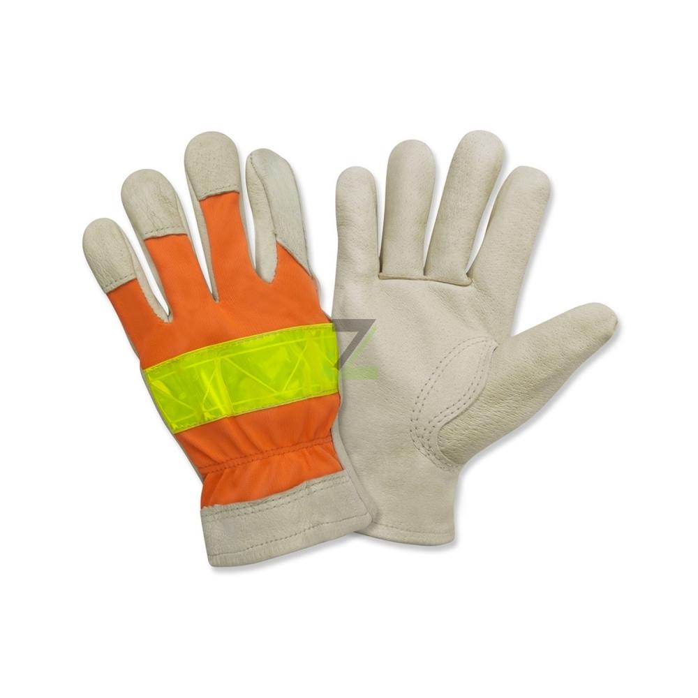 Fluorescent base materials (e.g. yellow, orange) Reflective trim or accents Durable synthetic fabrics like nylon, polyester or leather