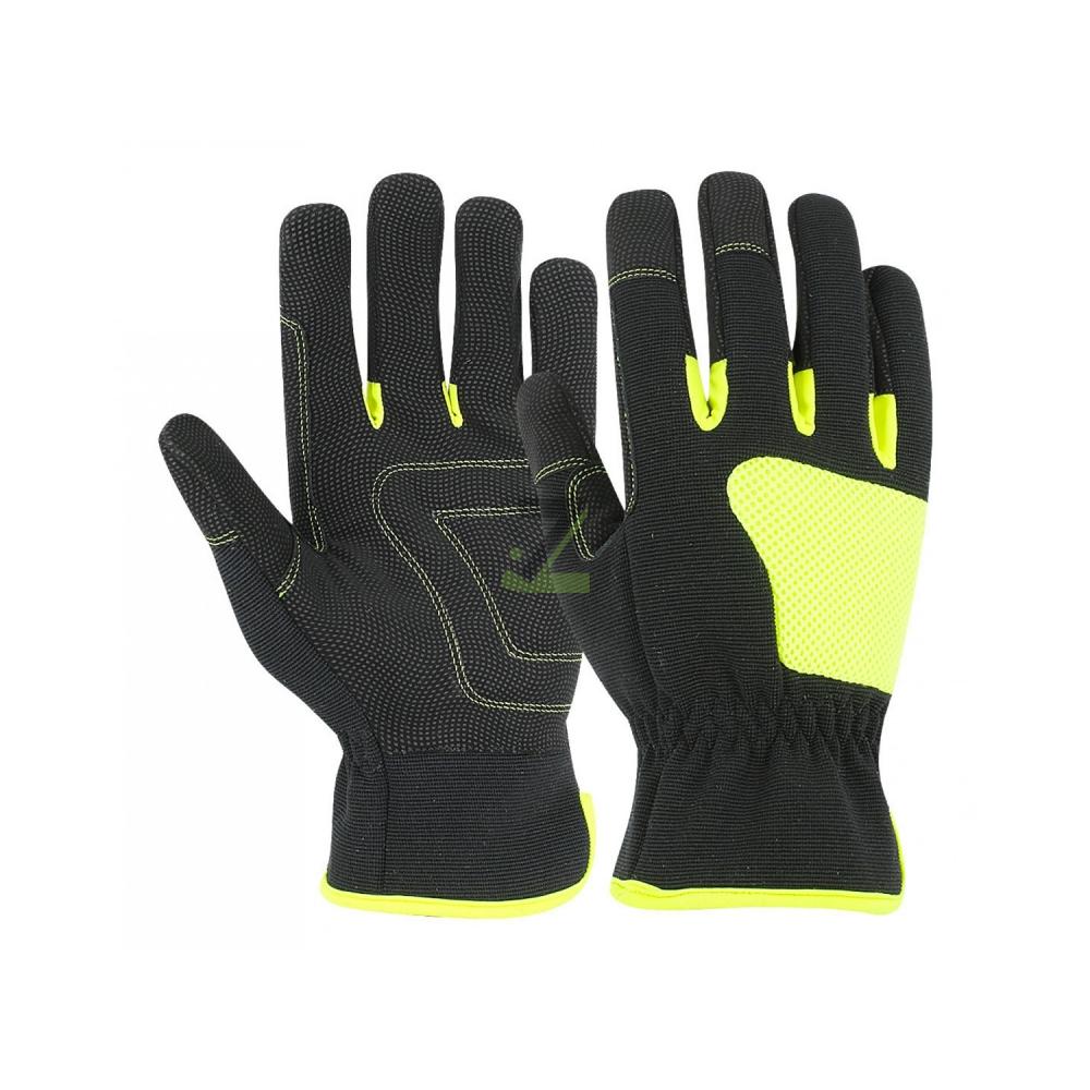 Leather (e.g. cowhide, goatskin) Canvas or cotton Synthetic fabrics (e.g. nylon, polyester) Reinforced palms and knuckles
